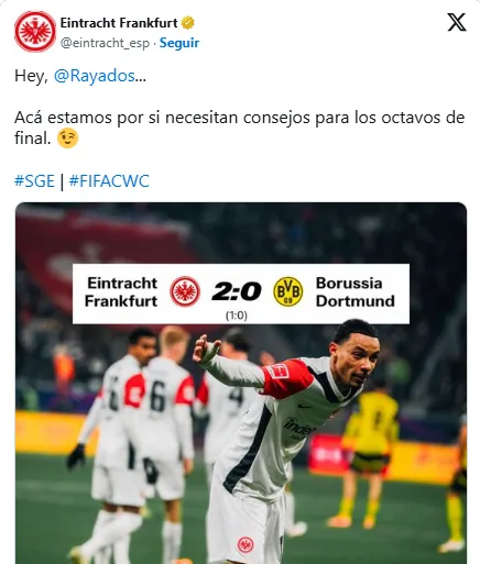 Fue a través de redes sociales que así hizo la propuesta el Frankfurt donde han desfilado mexicanos como Marco Fabián y Carlos Salcedo: “Hey, Rayados…Acá estamos por si necesitan consejos para los Octavos de Final”, acompañado de una imagen con el marcador 2-0 sobre el rival.