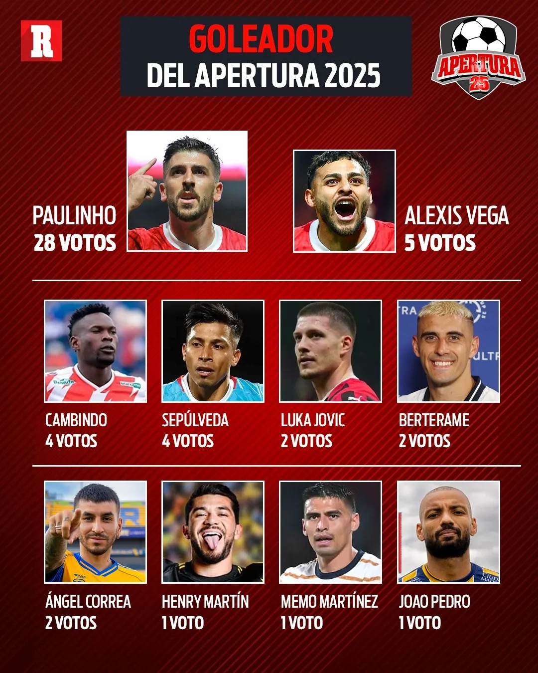 Para el título de goleador del torneo, Paulinho (Toluca) se posicionó como el principal candidato para ser tricampeón con 28 votos. Más atrás se ubicaron Alexis Vega con cinco, Diber Cambindo y Ángel Sepúlveda con cuatro cada uno, además de otros como Luka Jovic, Germán Berterame, Ángel Correa y Henry Martín.