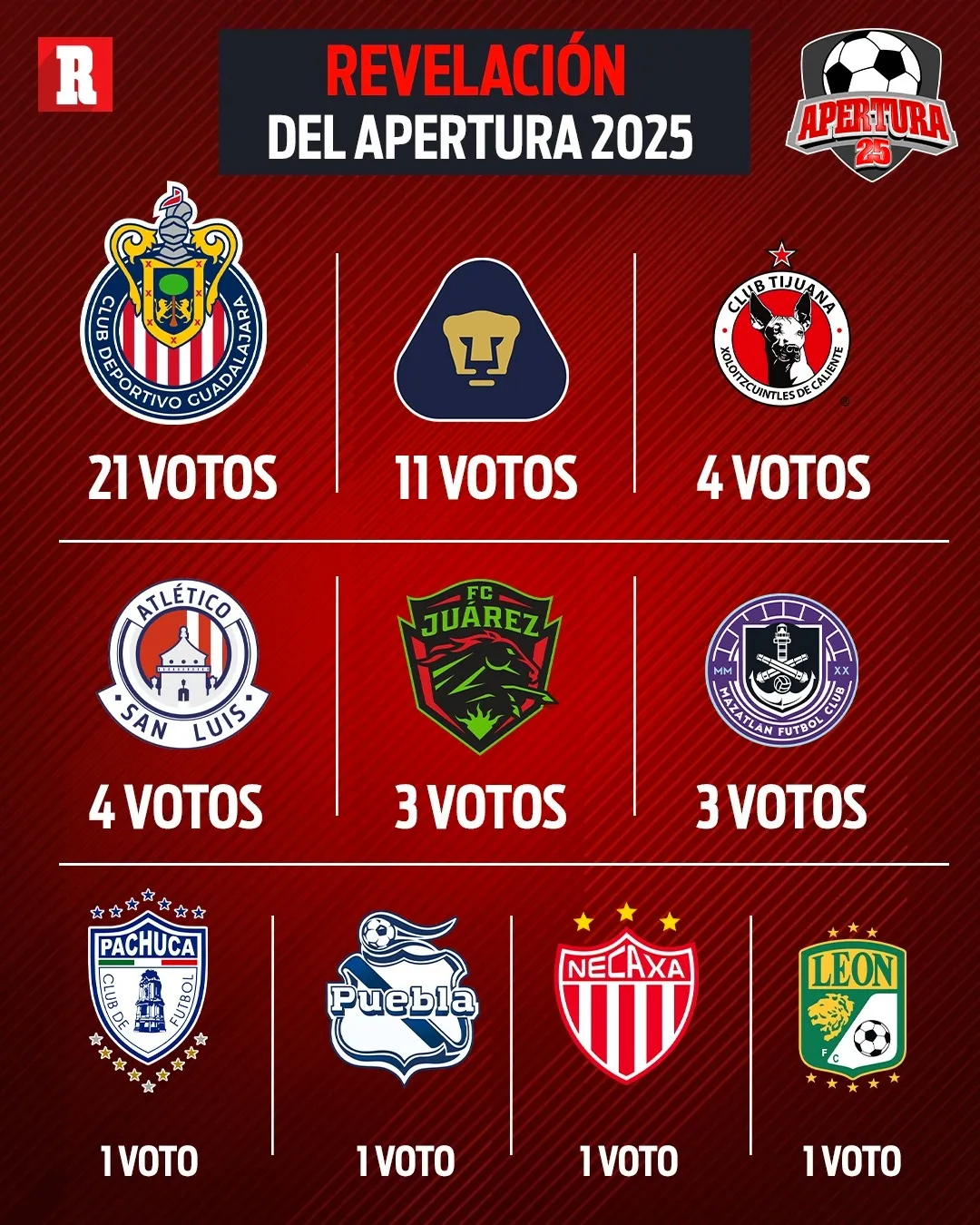 En cuanto al equipo revelación, Chivas recibió el respaldo mayoritario con 21 votos por parte de especialistas como Enrique Bermúdez, Jared Borgetti y Jorge Pietrasanta. El equipo rojiblanco fue seguido por Pumas con 11 votos y por Xolos y San Luis, ambos con cuatro. Otros clubes como Juárez, Mazatlán y Necaxa también fueron considerados, aunque con menor frecuencia.