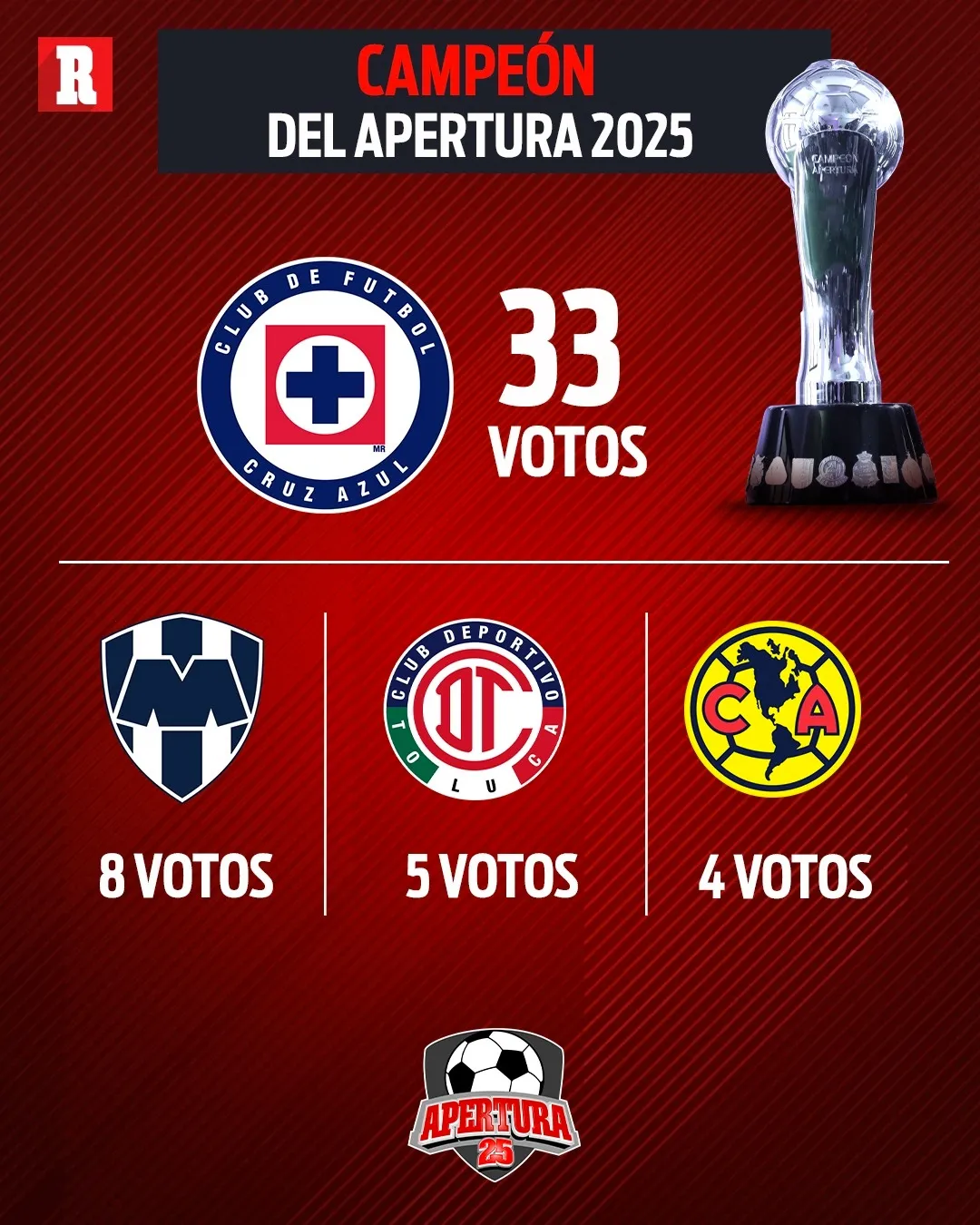 Tras la llegada de José Paradela, Jeremy Márquez y la posible incorporación de Luka Jovic, Cruz Azul recibió 33 votos para ser campeón; algunos de los votantes fueron David Faitelson, Rubén Rodríguez, Ricardo Peláez, entre otros. El resto se dividen en ocho para Rayados, club que recientemente llegó hasta Octavos de Final del Mundial de Clubes; cinco para Toluca, actual campeón del futbol mexicano; y cuatro para América, único tricampeón de torneos cortos.