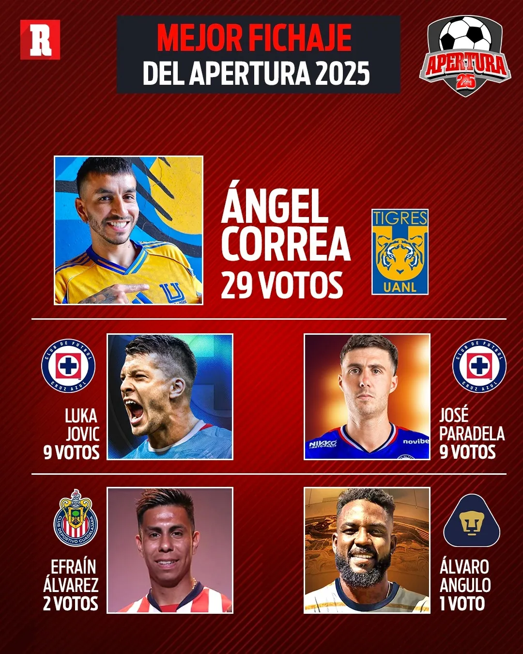 Respecto al mejor fichaje del torneo, Ángel Correa fue el más votado con 29 menciones. El argentino llegó como refuerzo de impacto y superó en las preferencias a Luka Jovic y José Paradela de Cruz Azul, quienes obtuvieron nueve votos cada uno. Efraín Álvarez, Álvaro Angulo y otros también figuraron en la lista.