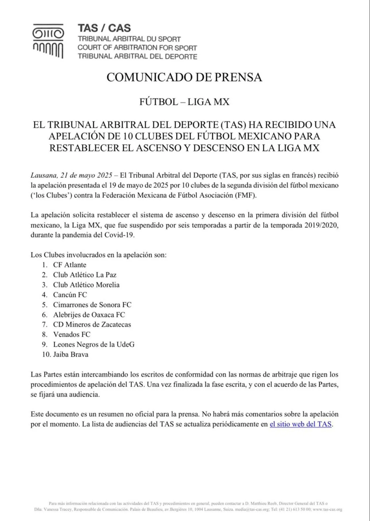 El TAS ha subrayado que la suspensión de ascensos y descensos en la Liga MX no es permanente y se considera temporal hasta 2026, sin modificar los estatutos de la FMF.