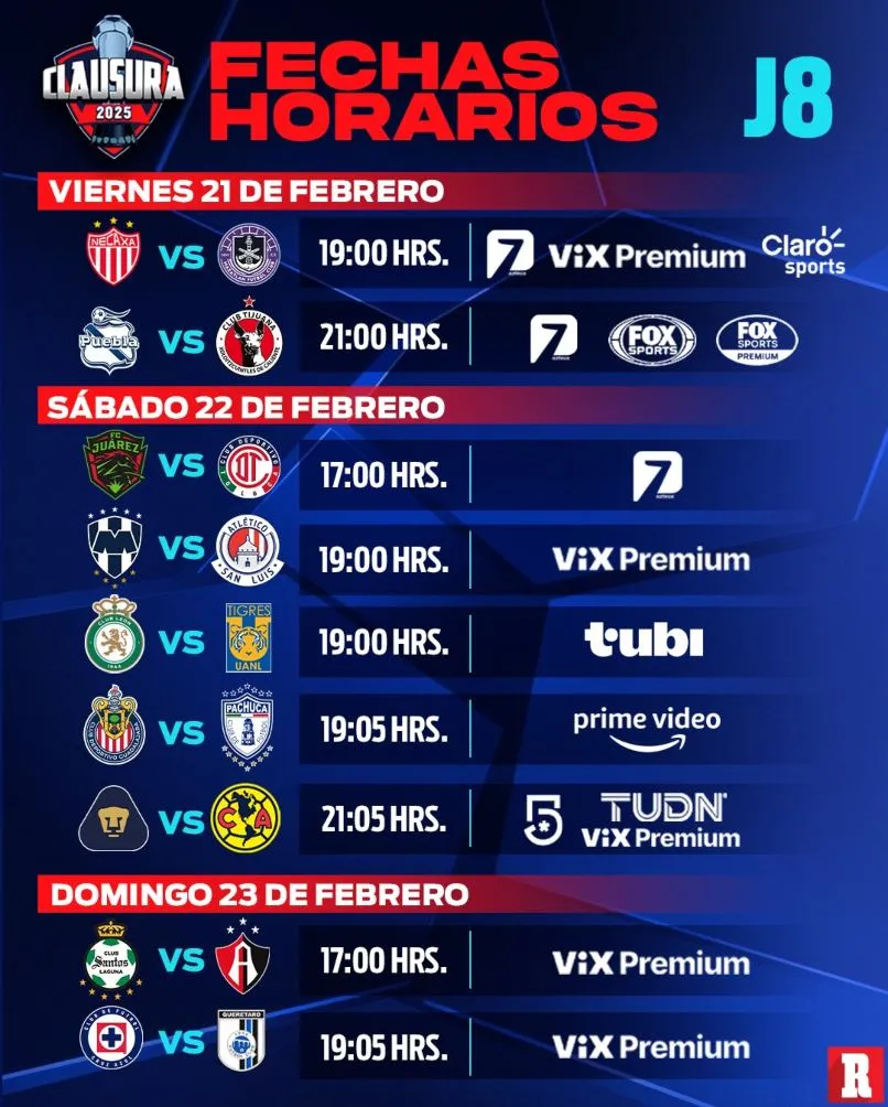 Pese a que la Viernes 21 de febrerodecidió adelantar un par de partidos de la Jornada 9 a mitad de semana, la Jornada 8 del Clausura 2025 se jugará este fin de semana y la pelea por los puestos más altos de la tabla continúa, además de que la zona de Play In también está cada día más apretada.
