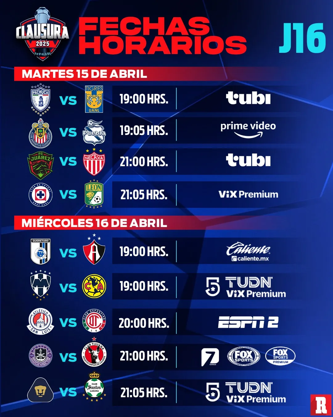 La Jornada, sin embargo, comenzará con cuatro encuentros este martes. Primero en punto de las 19:00 horas del centro de México Pachuca recibirá a Tigres en un juego transmitido por Tubi. A la misma hora Chivas, quienes buscan entrar el Play-In reciben a Puebla en un juego que será en exclusiva por streaming en Amazon Prime.