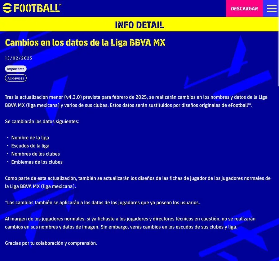 Konami aclaró que la liga mexicana seguirá disponible en el juego, solo que los nombres, logos y escudos de la liga, así como de los equipos, se cambiarán por diseños originales.