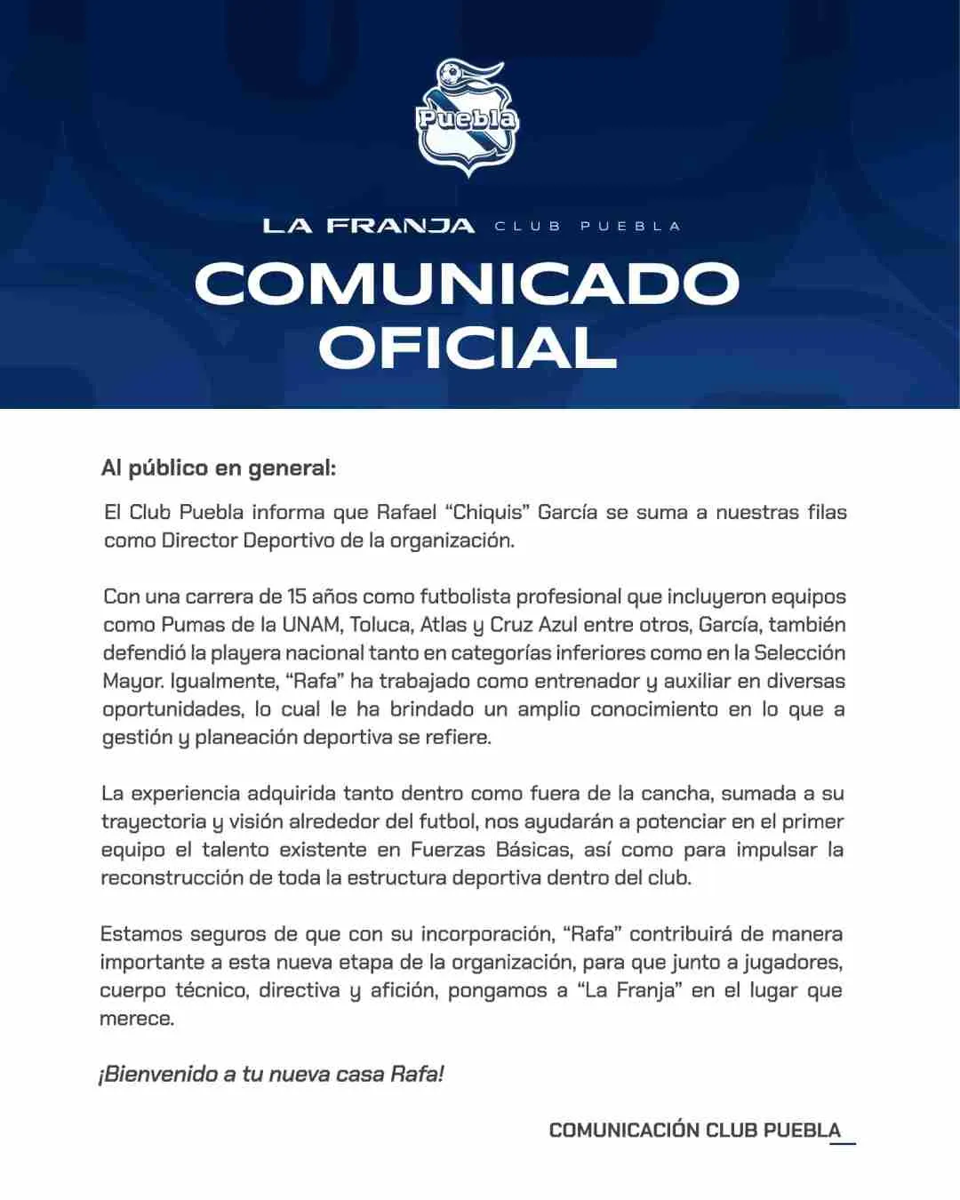 Así fue el comunicado que lanzó para anunciar el retorno de García: “El Club Puebla informa que Rafael ‘Chiquis’ García se suma a nuestras filas como Director Deportivo de la organización…”.