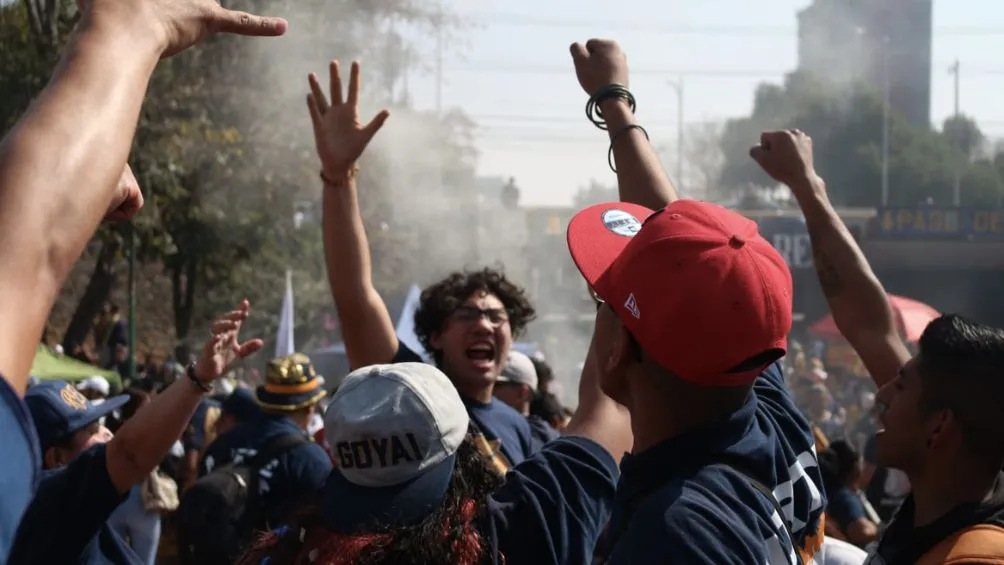 La barra de la UNAM inició su caravana a las 9:40 aproximadamente desde el metro Copilco rumbo a CU. Durante su trayecto los diferentes integrantes de la Rebel fueron amenizando el camino con cánticos, banderas y algunas bengalas azules y amarillas.