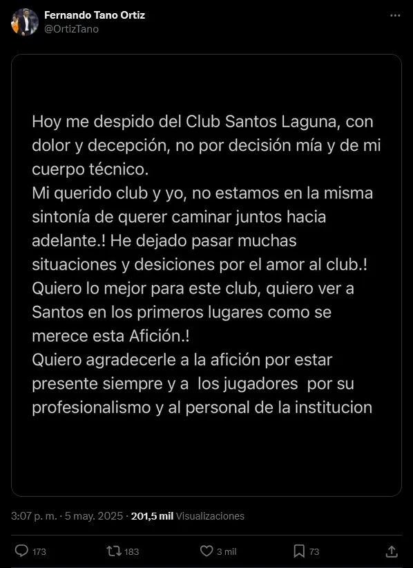 Previo al anuncio oficial de la institución, distintos medios manejaron la versión en la que señalaban que ‘Tano’ Ortiz había renunciado al puesto. Por medio de su cuenta oficial de X, el entrenador argentino aclaró que fue decisión de Santos despedirlo e inclusive da a entender que el equipo no tiene la intención de ‘ir juntos hacía delante’.