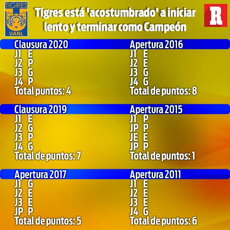La misma 'fórmula' se repitió para el Apertura 2016 (en el que le ganaron la Final al América), en el cual tuvieron dos empates y dos victorias al inicio del torneo, siendo el Apertura 2015 su peor inicio, ya que sólo sumaron un punto en las primeras cuatro jornadas para luego consagrarse campeones del máximo circuito mexicano frente a Pumas.