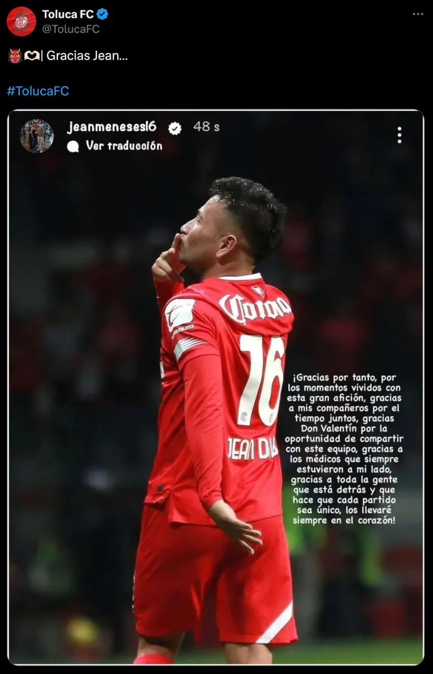 Jean Meneses se prepara para iniciar una nueva etapa en su carrera profesional fuera de la Liga MX y de Toluca, por lo que se despide de México tras seis años en jugar en la Primera División de nuestro país.