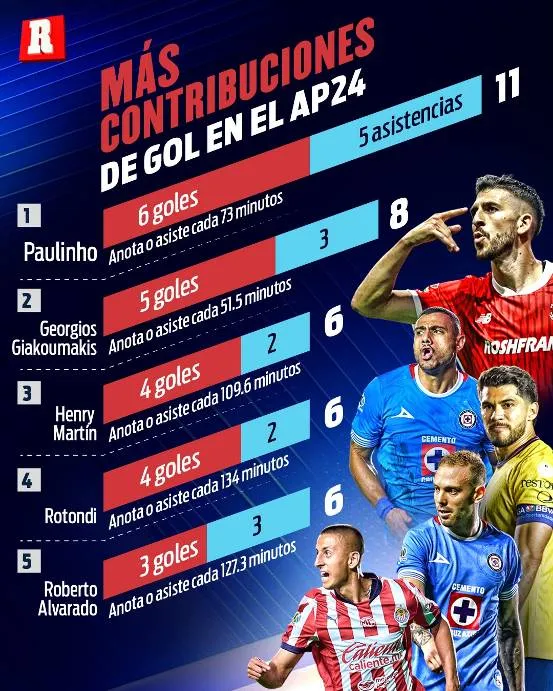 Luego de Paulinho y Georgios se encuentran tres jugadores empatados con seis contribuciones de gol en lo que va del torneo: Henry Martín de América, Carlos Rotondi de Cruz Azul y Roberto Alvarado de Chivas.