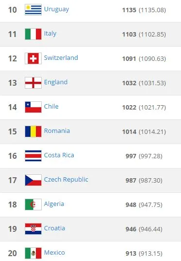 Por otra parte, la campeona del mundo, Alemania, se mantiene en la cima seguida por Argentina, que terminó en segundo lugar tras perder contra el conjunto teutón en la Final del Mundial de Brasil 2014.
