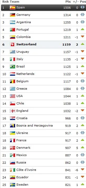 Suiza ocupa ahora la sexta posición tras superar a Uruguay e Italia.