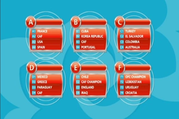 Por el momento, ya hay cuatro equipos del continente africano, calificados a la Copa del Mundo: Egipto, Ghana, Mali y Nigeria; sólo hace falta definir al campeón de dicha confederación para establecer en qué cuartetos estarán incluídos. El campeonato africano se realizará del 16 al 30 de marzo en Argelia.