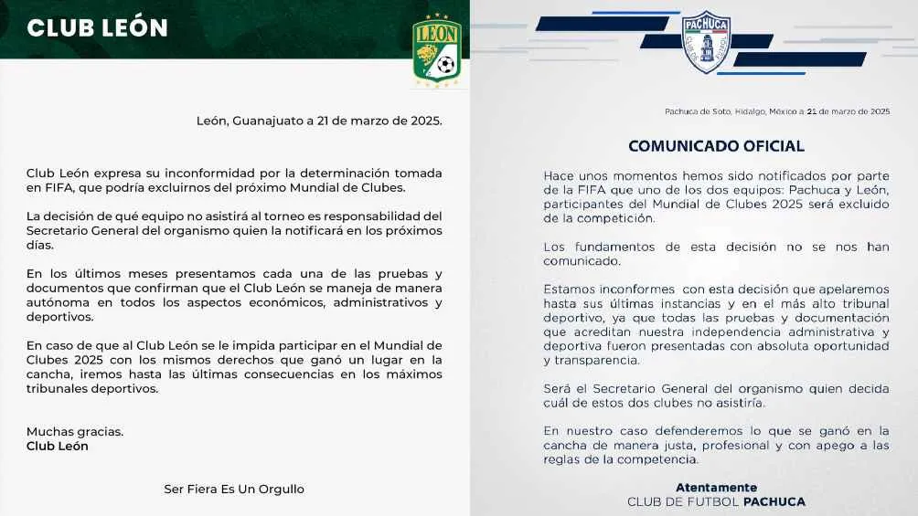 Este viernes, Pachuca y León emitieron comunicados sobre la decisión tomada por la FIFA. En su mensaje, los Tuzos declararon: "Hace unos momentos hemos sido informados por la FIFA que uno de los dos equipos: Pachuca y León, participantes en el Mundial de Clubes 2025, será excluido de la competición."