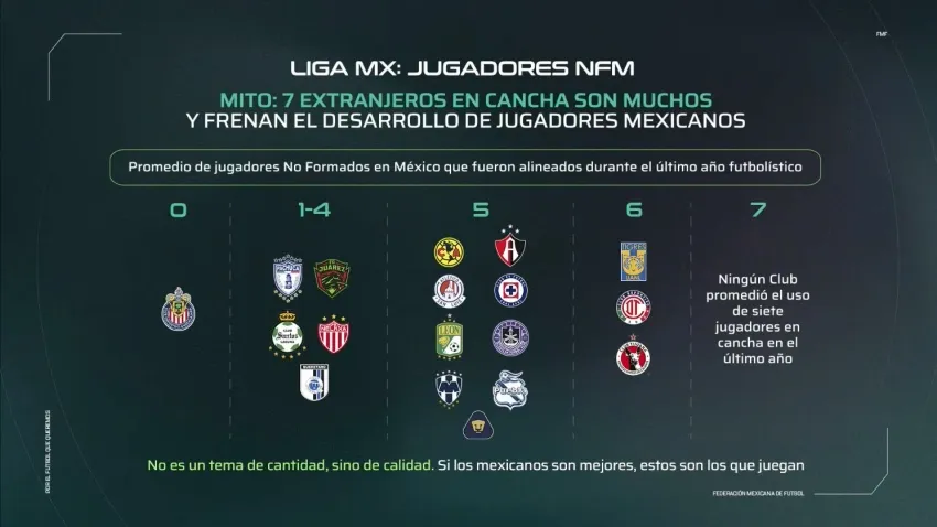 En el video presentado, la FMF señaló que, durante la temporada 2023-2024, ningún equipo promedió el uso de siete jugadores en la cancha, tal y como estaba permitido. América, Cruz Azul y Pumas, promediaron cinco NFM dentro del campo.