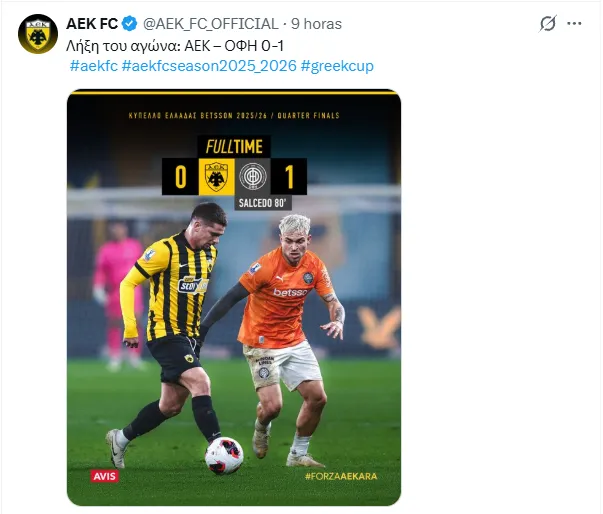 El cierre estuvo marcado por acciones disciplinarias. En el tiempo añadido, Thiago vio la segunda amarilla y fue expulsado al 90+9’, mientras que Filipe Relvas recibió amonestación. Minutos antes, Vasilis Lambropoulos también fue expulsado, dejando a OFI Creta con nueve jugadores. A pesar de la superioridad numérica en los instantes finales, AEK no logró alterar el marcador y OFI Creta selló su pase a las semifinales.