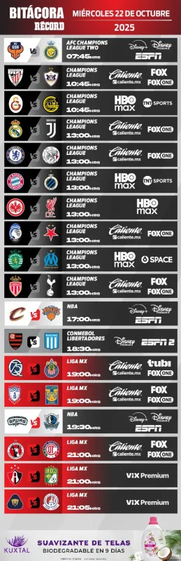 La actividad deportiva de este miércoles 22 de octubre se presenta como una auténtica maratón de emociones, con el cierre de la jornada doble de la Liga MX, duelos clave en la UEFA Champions League y, lo más esperado para muchos, el emocionante inicio de la temporada regular de la NBA.