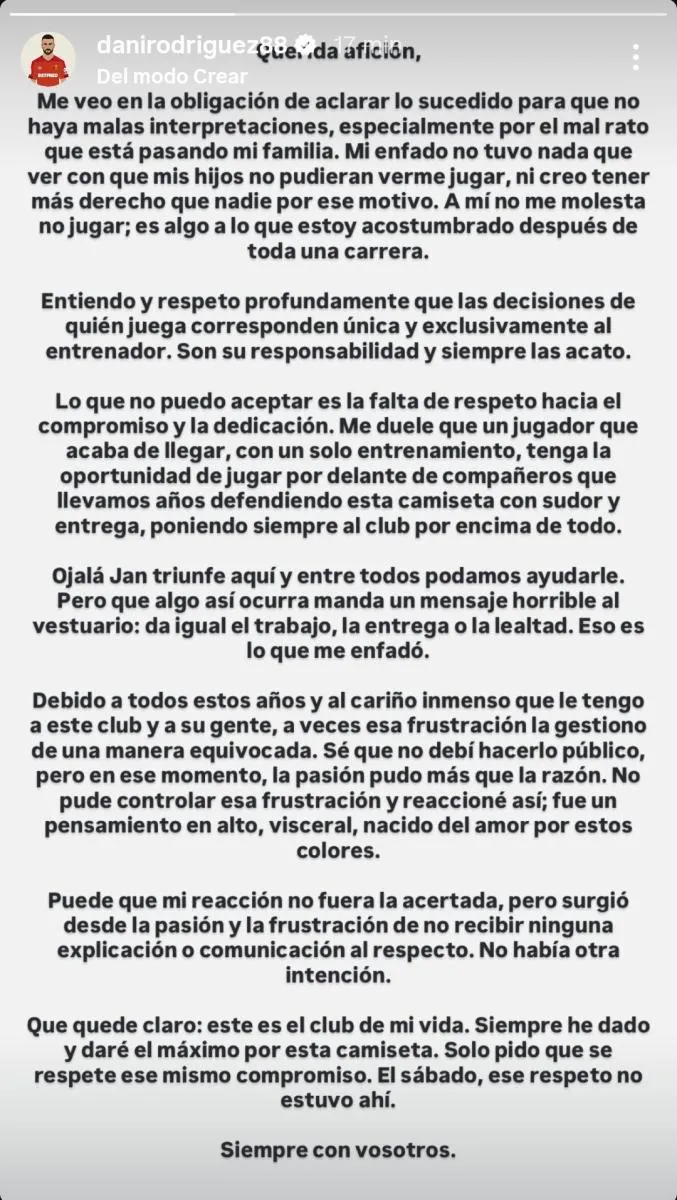 "Me duele que un jugador que acaba de llegar, con un solo entrenamiento, tenga la oportunidad de jugar por delante de compañeros que llevamos años defendiendo esta camiseta con sudor y entrega.