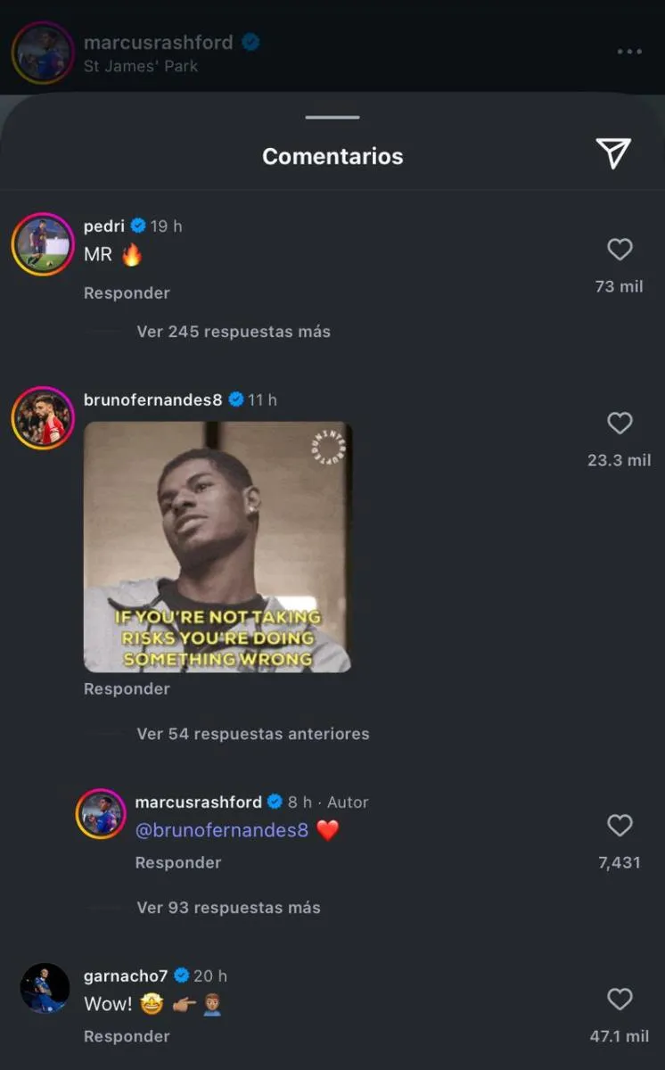 Jugadores como Pedri, Bruno Fernandes, Garnacho y Rasmus Højlund fueron algunos de los jugadores que felicitaron a Rashford en su publicación, además del propio Barcelona que le dio todo el reconocimiento tras el triunfo.