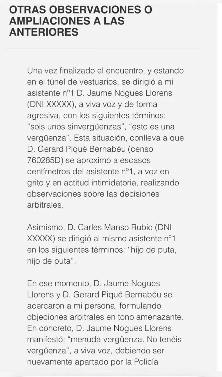 Además de Piqué, el silbante mencionó que otras personas de la directiva no solo lo atacaron a él, sino que también se metieron con el resto del cuerpo arbitral, insultándolos y amenazándolos.