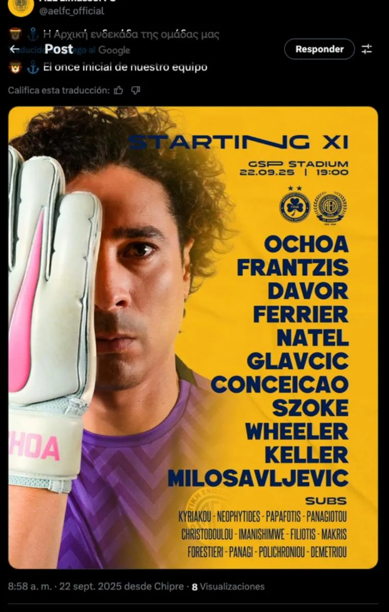 El club confirmó su alineación inicial para la visita frente al Omonia, en duelo correspondiente a la Jornada 4 del campeonato local, con Ochoa encabezando el XI inicial.