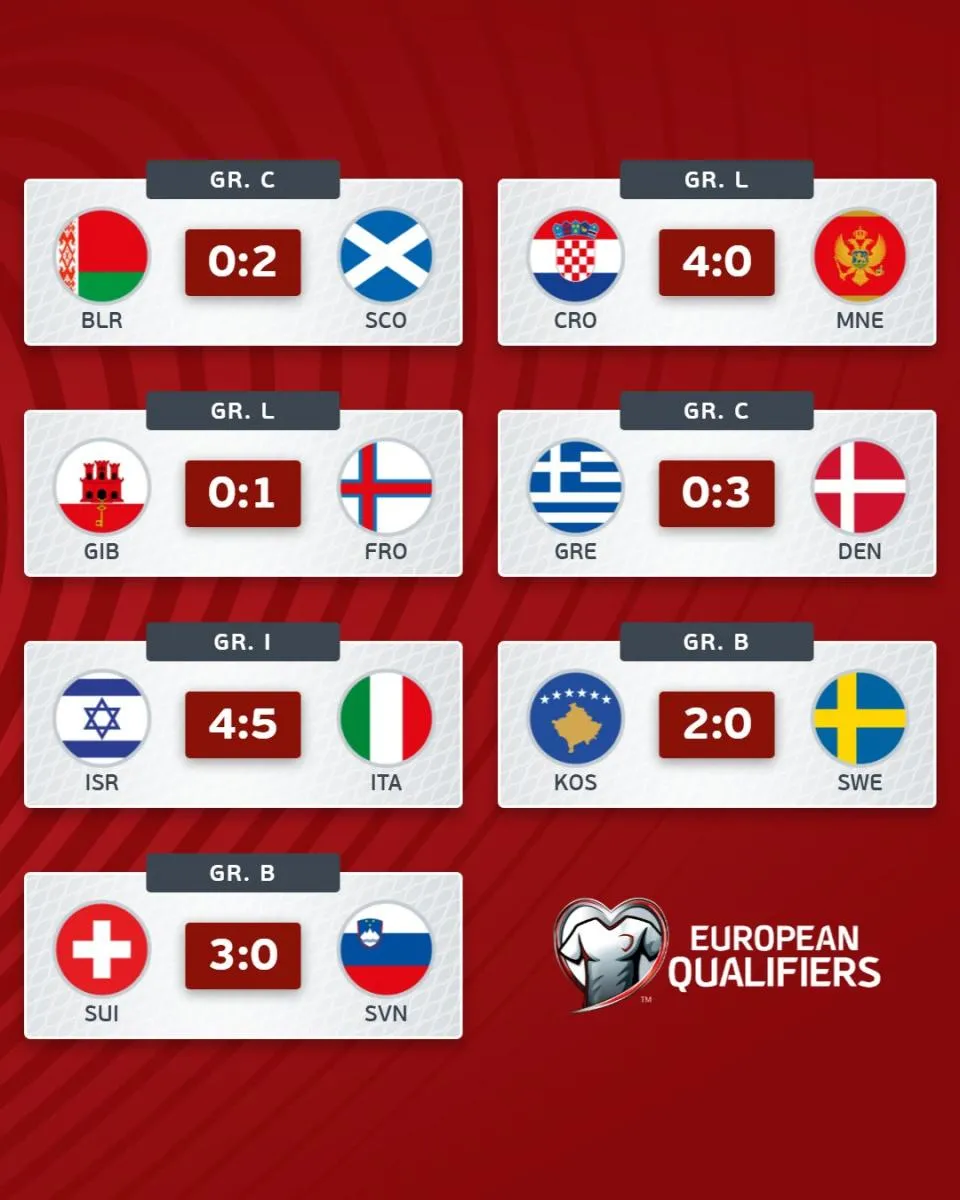 Pese a jugar como local, Gibraltar no pudo aprovechar la oportunidad y cayó ante las Islas Feroe, que suman 6 unidades. Sin embargo, los isleños están prácticamente fuera de la contienda en un sector donde Croacia y República Checa pelean el liderato.