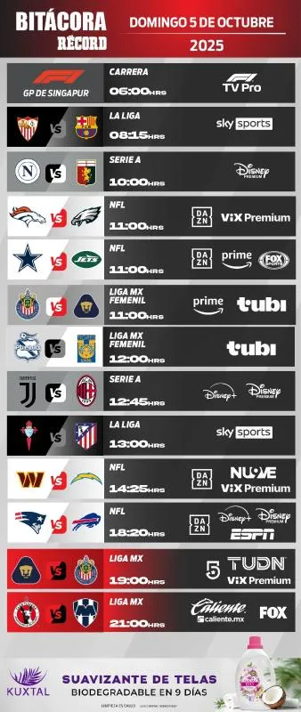 Finalmente, la cartelera deportiva se cierra con par de partidos, de la Jornada 12 del Apertura 2025, el primero de ellos desde Ciudad Universitaria donde los Pumas se enfrentarán a las Chivas, en duelo por afianzarse en el Play-In.