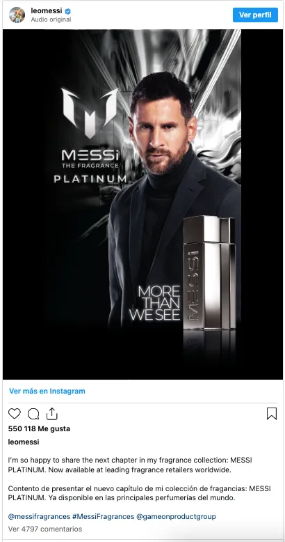 El ‘10’ oficializó su nueva fragancia llamada ‘Messi Platinum’: “Contento de presentar el nuevo capítulo de mi colección de fragancias: MESSI PLATINUM. Ya disponible en las principales perfumerías del mundo”.