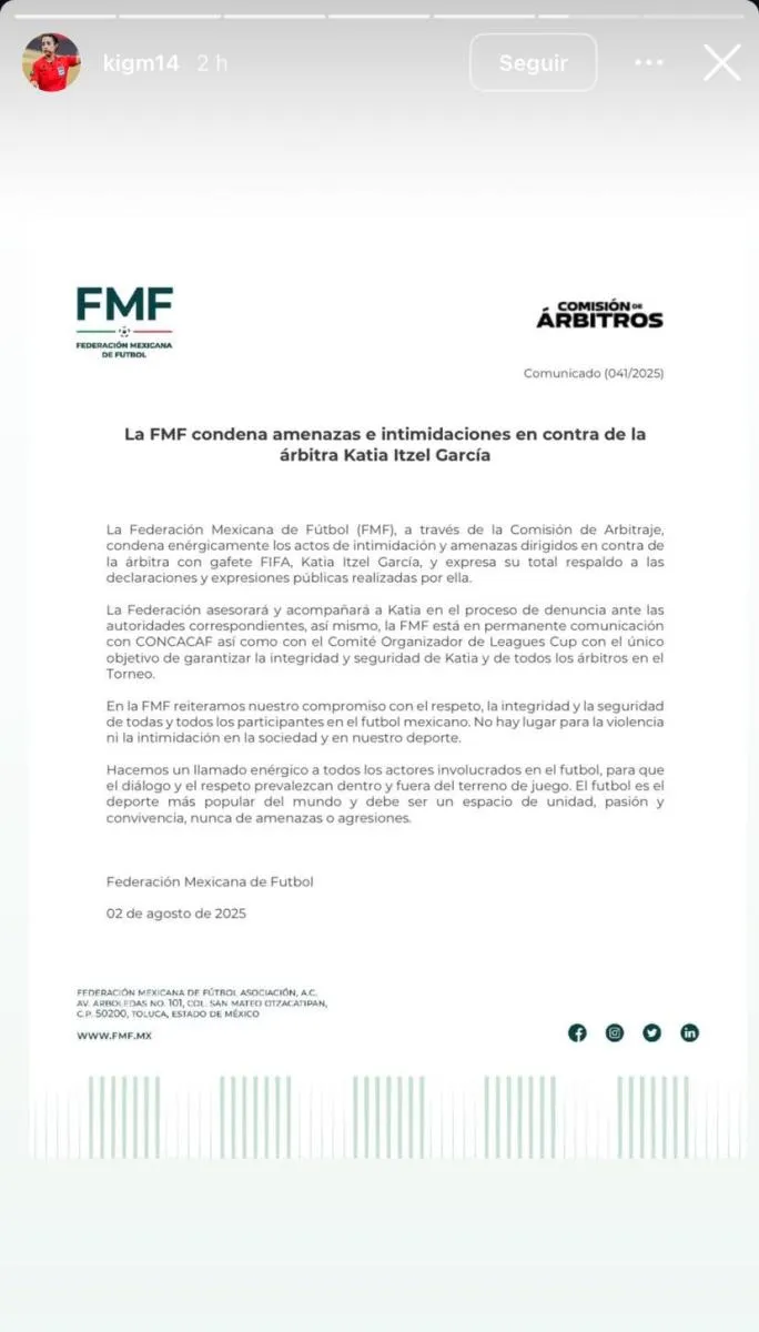 Horas después de denunciar al agresor, Katia volvió a publicar en sus redes que tanto fácticos como asociaciones ya se pronunciaron para apoyarla, incluyendo la Federación Mexicana de Futbol.