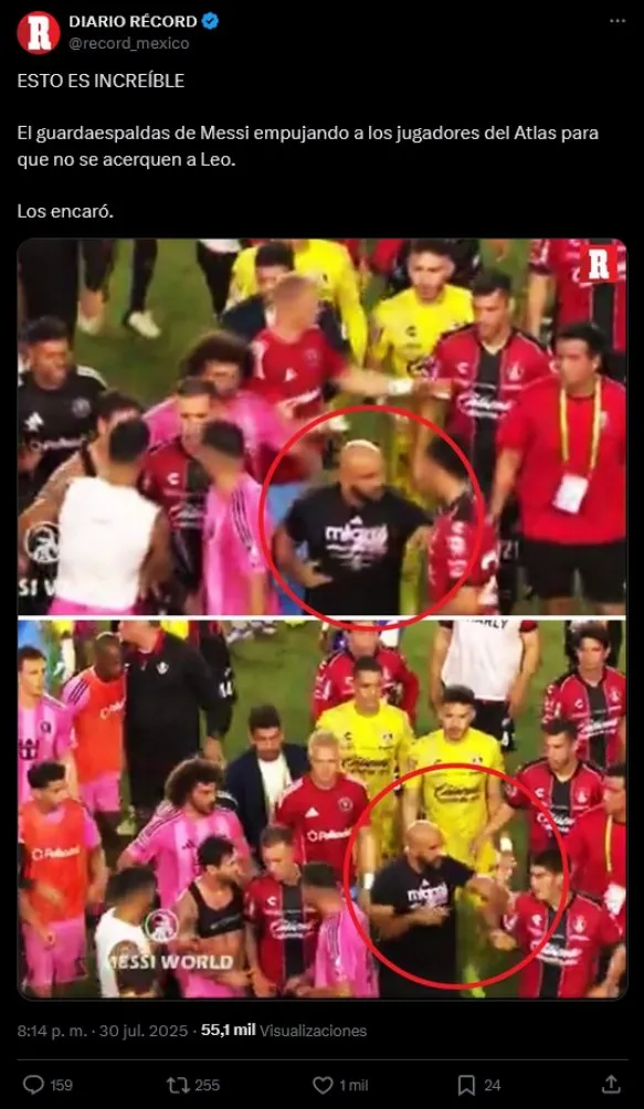 El partido terminó con los ánimos calientes y tras el pitazo final jugadores del Inter de Miami y Atlas se enfrascaron en empujones y gritos, ahí fue donde apareció Yassine Cheuko. El famoso guardaespaldas de Messi corrió al centro del campo para defender al ‘10’ argentino.