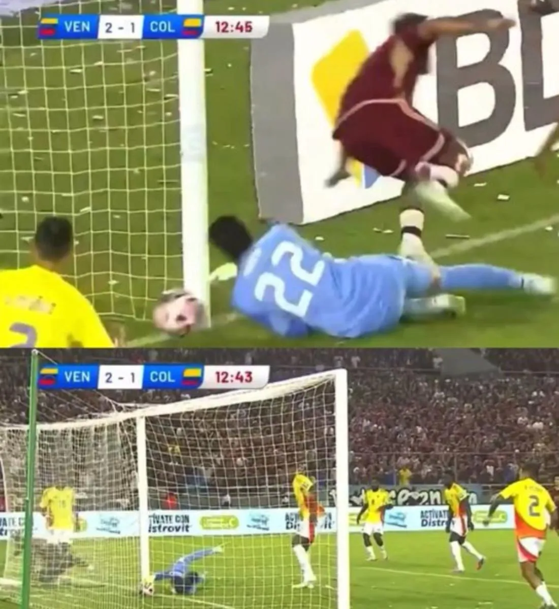 Tras la acción, el portero colombiano se quedó tendido sobre el césped reclamando una falta del atacante venezolano, aunque el silbante desestimó la protesta y pidió reanudar el juego.