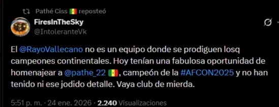 “El Rayo no es un equipo donde se prodiguen los campeones continentales. Hoy tenían una fabulosa oportunidad de homenajear a Pahté, campeón de la Copa Africana de Naciones y no han tenido ese jodido detalle, vaya club de mierda”, se lee en la publicación que reposteo el jugador.
