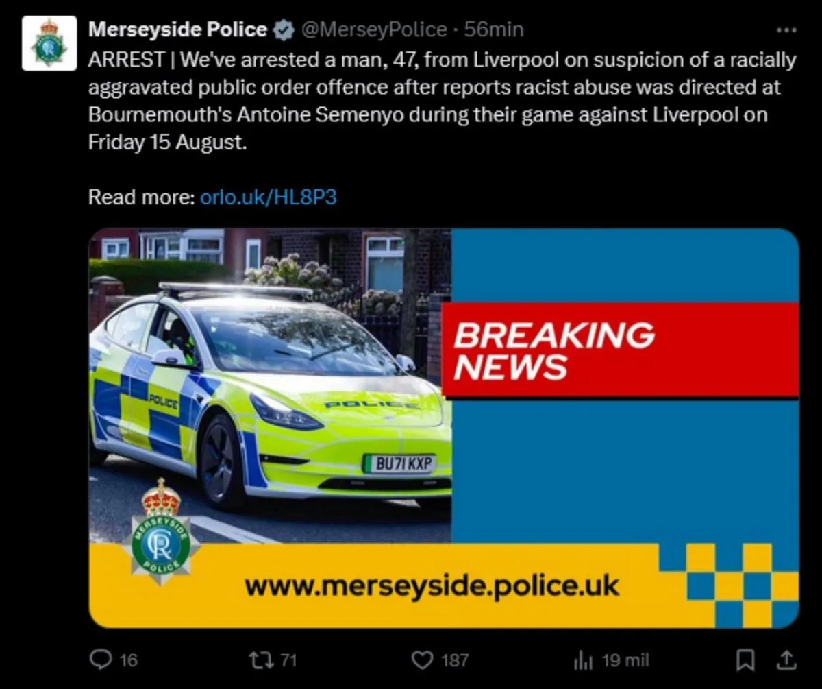 La policía de Merseyside arrestó a un aficionado del Liverpool acusado de agredir verbalmente con insultos racistas a Antoine Semenyo, jugador del Bournemouth, durante el duelo disputado en Anfield en el arranque de la temporada de la Premier League.