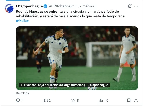 24 horas después de que Huescas se viera obligado a retirarse del juego, el equipo de Dinamarca lanzó un comunicado que confirmó lo peor para el futbolista. Huescas sufrió una rotura del ligamento cruzado anterior de la rodilla derecha, por lo que se perderá toda la temporada y pone en riesgo su participación en el Mundial.