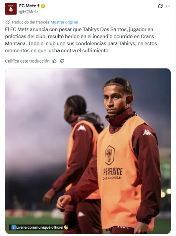 El futbol europeo se encuentra de luto tras confirmarse que Tahirys Dos Santos, joven jugador francés de 19 años perteneciente al Metz, resultó gravemente herido en el devastador incendio ocurrido durante la celebración de Año Nuevo en Crans-Montana, Suiza. El siniestro dejó un saldo preliminar de alrededor de 40 personas fallecidas y al menos 115 heridos, muchos de ellos en estado crítico.