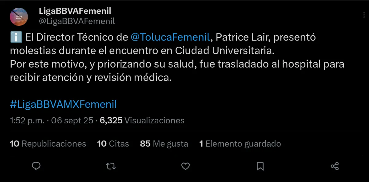 La victoria 1-2 de Toluca en su visita a Pumas, en la Jornada 10 del Apertura 2025 de la Liga MX Femenil, se vio empañado por la emergencia médica de su estratega Patrice Lair. El francés salió en el carrito de las asistencias poco antes del final del partido y la asistente Shirley Cruz se quedó en el banquillo escarlata.