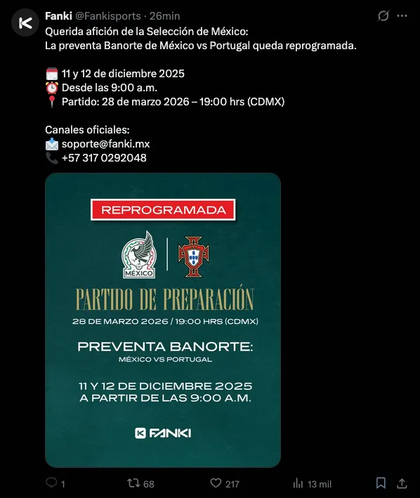 Tras una jornada llena de confusión y problemas técnicos en la venta de entradas, Fanki Sports, la empresa encargada de la boletería, ha confirmado la reprogramación de la preventa para el partido amistoso entre la Selección de México y Portugal.