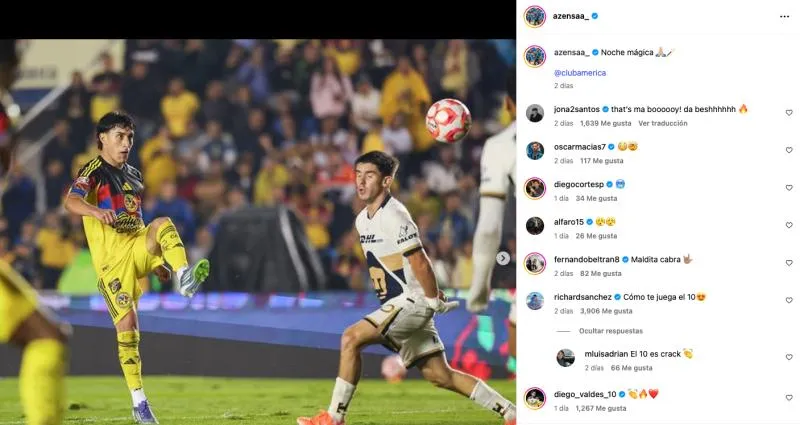 Por medio de Instagram, dos excompañeros de Alejandro Zendejas en América respondieron a su más reciente publicación en la que celebra la victoria ante Pumas además de su espléndida actuación con dos goles, uno de ellos probablemente el mejor de todo el fin de semana; aunque no solamente eran comentarios de examericanistas los que se presentaron en dicho post.