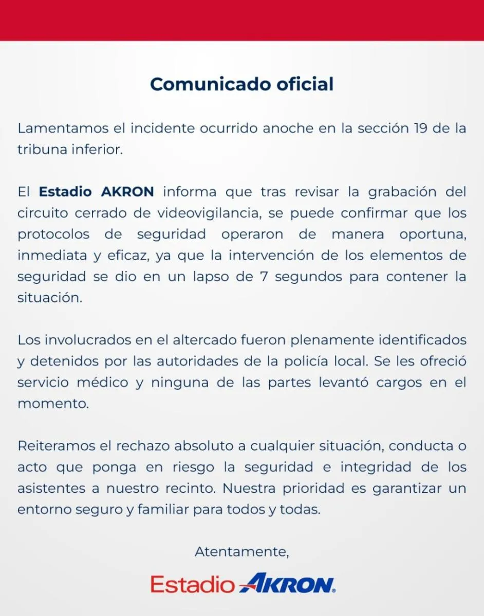 “Lamentamos el incidente ocurrido anoche en la sección 19 de la tribuna inferior. El Estadio AKRON informa que, tras revisar la grabación del circuito cerrado de videovigilancia, se puede confirmar que los protocolos de seguridad operaron de manera oportuna, inmediata y eficaz, ya que la intervención de los elementos de seguridad se dio en un lapso de 7 segundos para contener la situación”, informó el club.
