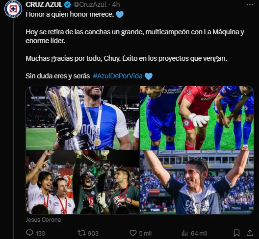 “Hoy se retira de las canchas un grande, multicampeón con La Máquina y enorme líder. Muchas gracias por todo, Chuy. Éxito en los proyectos que vengan. Sin duda eres y será Azul De Por Vida”, remata el mensaje acompañado de una serie de imágenes.