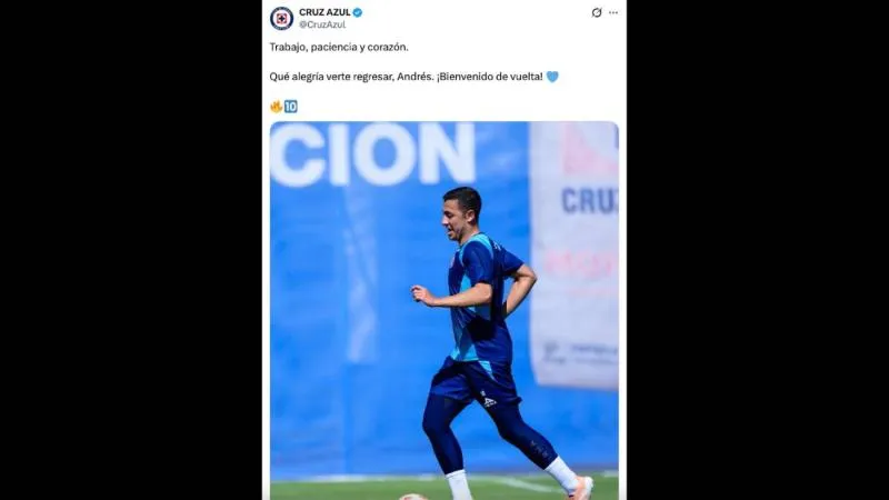 En medio de una noticia muy difícil de digerir para la afición de Cruz Azul (la salida de Ignacio Rivero), la cuenta de X del equipo ha publicado una imagen que significa una buena noticia para los cementeros, pues en ella se puede ver a Andrés Montaño, recuperado, entrenando y sonriendo de poder estar de vuelta después de haber sido víctima de una aparatosa lesión.