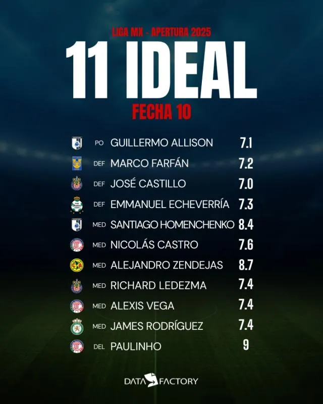 Con jugadores como Paulinho, Alexis Vega y Nicolás Castro, el campeón lidera la lista de los mejores de esta décima fecha. Después de Toluca, el equipo del Guadalajara es el que más nombres componen esta lista, con José Castillo y Richard Ledezma, luego de su gran partido contra Necaxa.