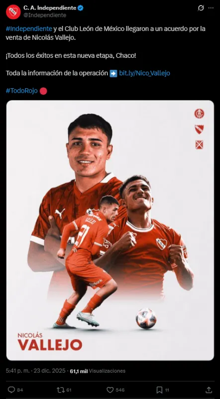 El Club Atlético Independiente oficializó los detalles del acuerdo alcanzado con León por el traspaso del juvenil Nicolás Vallejo. La negociación no solo implica la salida del atacante argentino, sino que se traduce en una maniobra financiera estratégica que permite al "Rojo" sanear deudas y aumentar su patrimonio sobre otros activos.