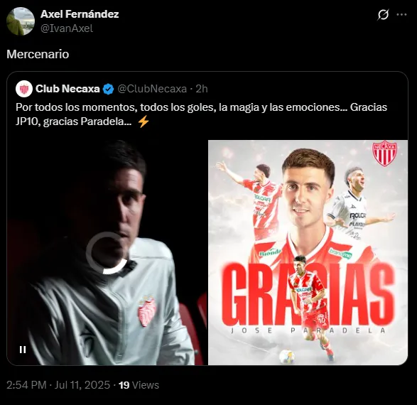 Necaxa se despidió de José Paradela, quien es nuevo jugador de Cruz Azul. Ante ello, los aficionados de los Rayos explotaron contra el futbolista y lo llamaron "mercenario" por decidir irse a otro club.