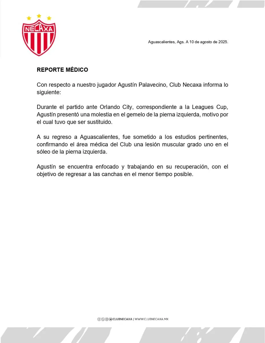 A través de una publicación en redes sociales, el cuadro hidrocálido informó que, Palavecino dejó el terreno de juego en su último partido de Leagues Cup ante Orlando City por molestias musculares en el gemelo de la pierna izquierda.