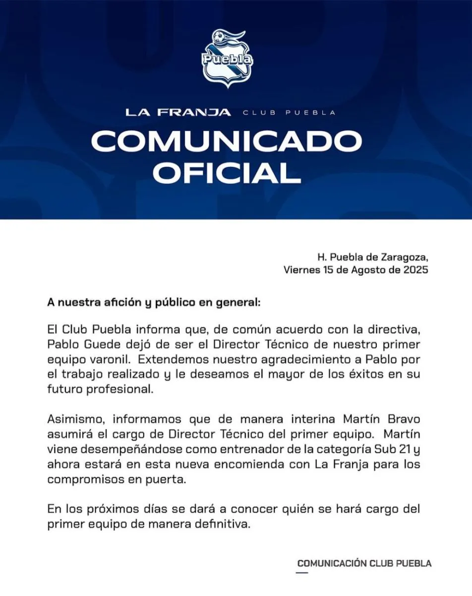 “Informamos que de manera interina Martín Bravo asumirá el cargo de Director Técnico del primer equipo. Martín viene desempeñándose como entrenador de la categoría Sub 21 y ahora estará en esta nueva encomienda con La Franja para los compromisos en puerta”, comunicó el Puebla.
