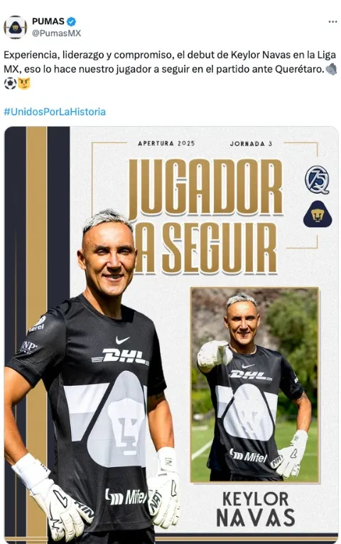 Así, con ese cupo libre, Keylor Navas ya fue registrado con el primer equipo y a partir de este mismo viernes podrá jugar con Pumas en Liga MX. Cabe resaltar que el arquero tico portará el número uno en la espalda, dorsal que llevó Alex Padilla el torneo anterior. Con esto, todo apunta que el portero de la Selección de Costa Rica debutará este mismo viernes en el Estadio Corregidora ante Querétaro.