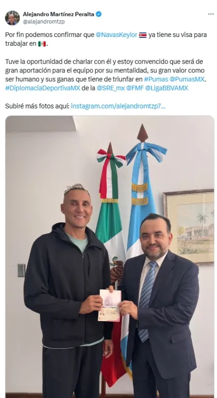“Por fin podemos confirmar que Keylor Navas ya tiene su visa para trabajar en México. Tuve la oportunidad de charlar con él y estoy convencido que será de gran aportación para el equipo por su mentalidad, su gran valor como ser humano y sus ganas que tiene de triunfar en Pumas”, dijo Alejandro Martínez Peralta, cónsul de México en Guatemala.