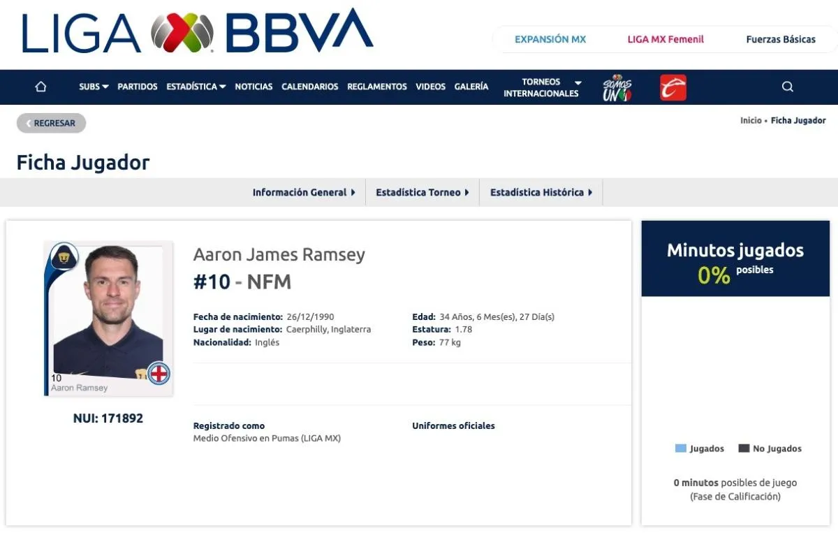 Uno de los refuerzos de Pumas para el Apertura 2025 que ha llamado la atención con su llegada, ha presentado un pequeño problema con su registro. Aaron Ramsey no tiene la nacionalidad correcta en su aparición dentro de la página oficial de la Liga MX, situación que ha levantado sospechas al respecto de su posible debut.